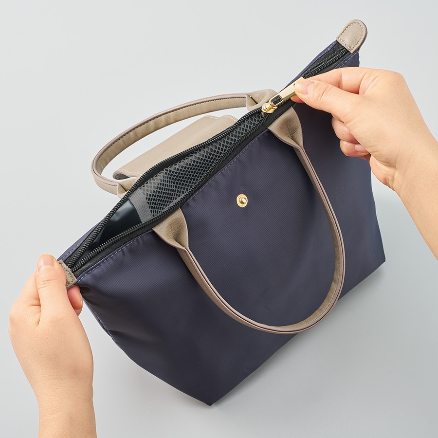 内側には保冷剤を入れられるメッシュポケットを装備。真夏の通勤やレジャーでも、お弁当をしっかり冷やしてくれる安心設計です。