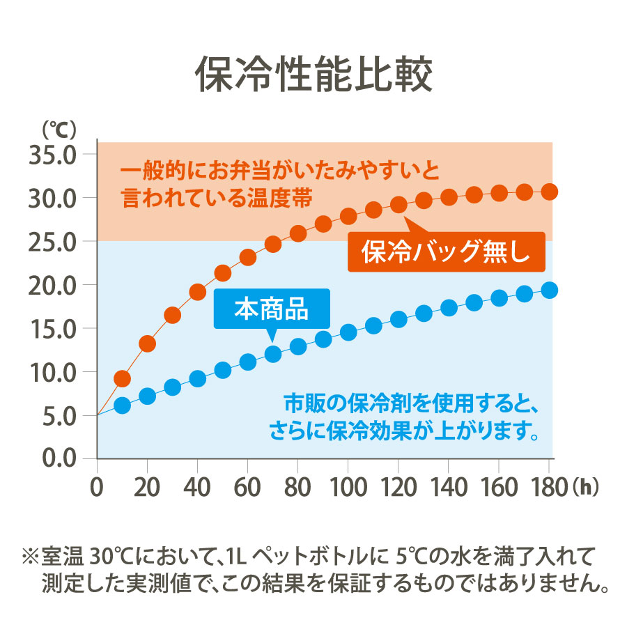 内側はアルミ素材+クッション素材を含む三層構造。冷たさをしっかりキープし、お弁当や飲み物の鮮度を保ちます。